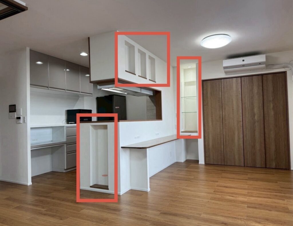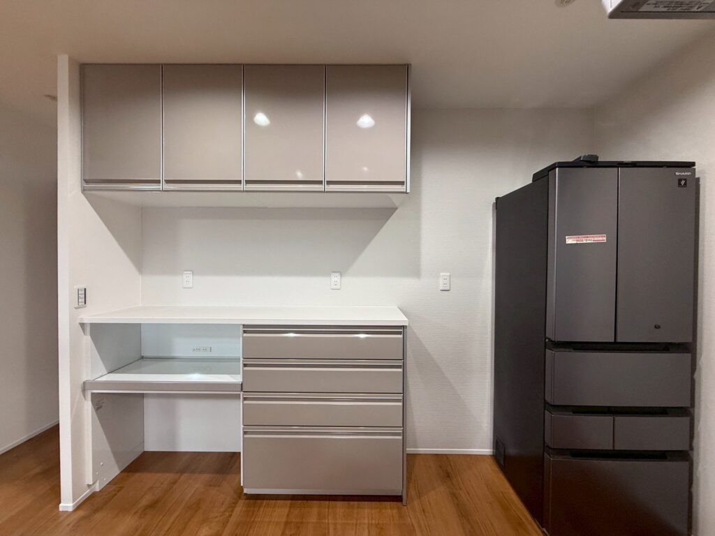 そんなお悩みを解消するには、キッチンとお揃いのバック棚収納がおすすめです!