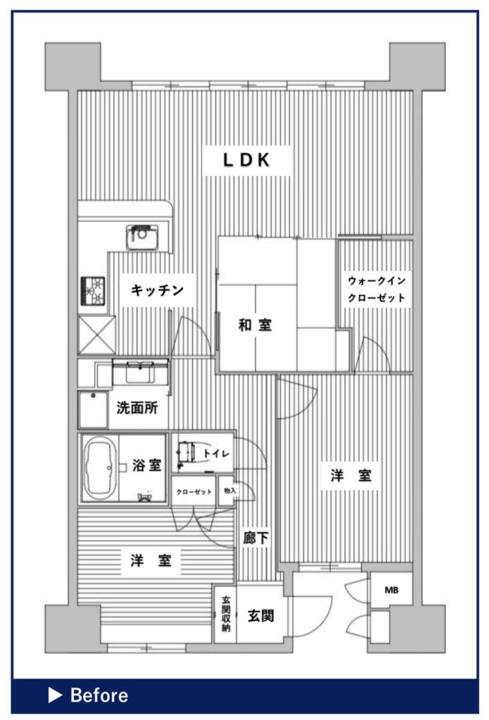 廊下として使われていたスペースを洗面台エリアとサニタリールームに分けて配置しました。