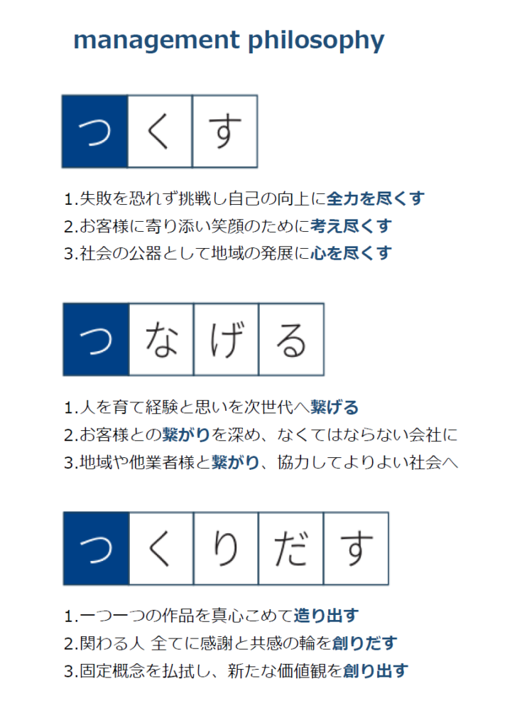 私たちは、お客様、社員、協力業者の幸せを実現させる事を目的とするため日々、時代の変化に順応し、